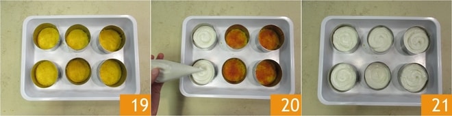 Jetzt die Biskuitkreise in Ausstecher von der gleichen Größe wie die Kreise, etwa 5 cm hoch, geben 19. Mit der Alkermes-Tränke tränken 20 und mit der Ricottacreme füllen 21. Mit einem Stück Frischhaltefolie abdecken und dann für mindestens 10 Stunden in den Kühlschrank stellen.