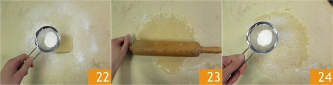Nach dieser Zeit die Mandelmasse zubereiten. Eine Arbeitsfläche mit reichlich Puderzucker bestäuben, die Mandelmasse darauf legen und weiteren Puderzucker hinzufügen 22. Die Masse mit einem Nudelholz ausrollen 23, bis eine Dicke von 2 mm erreicht ist, und immer wieder mehr Puderzucker hinzufügen, damit sie nicht an der Arbeitsfläche klebt 24.