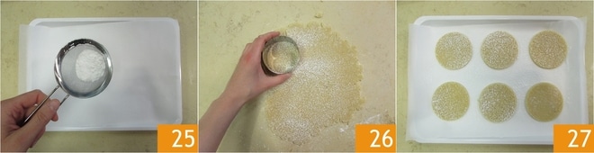 Nun ein Backblech mit Backpapier auslegen, weiteren Puderzucker hinzufügen 25 und die Mandelmasse erneut mit Puderzucker bestäuben. Mit einem Ausstecher Kreise ausstechen 26 und auf das Blech übertragen 27. Im Kühlschrank aufbewahren.
