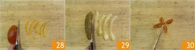 Jetzt die kandierten Früchte vorbereiten. Die Orange 28 und die Zitrone 29 in Scheiben schneiden. Die Mandarinen vierteln, ohne das innere Fruchtfleisch zu beschädigen 30