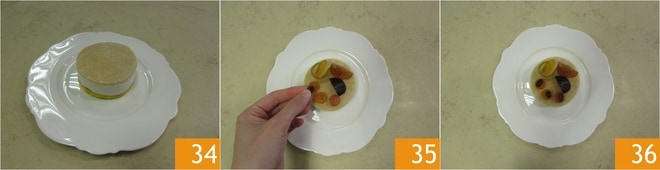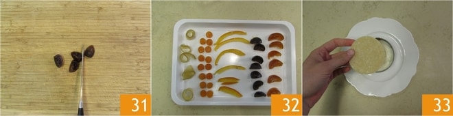 und das Gleiche mit den Quinottis machen 31. Auch kleine Knöpfe aus der Orange ausstechen. Alles auf einer kleinen Platte arrangieren 32 und bis zur Dekoration beiseite stellen. Eine der Cassatine auf einen Teller legen, im Ausstecher einen Kreis aus Mandelmasse platzieren 33,