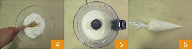 Gut mit einem Löffel mischen 4 und wenn Sie eine homogene Masse erhalten haben, in einen Mixer geben. Gut mixen, bis eine sehr glatte Textur entsteht 5. Danach in einen Spritzbeutel ohne Tülle füllen 6 und im Kühlschrank aufbewahren.