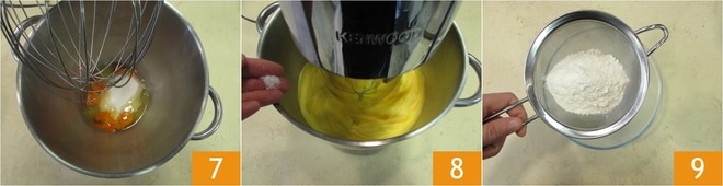 Bereiten Sie jetzt den Biskuitboden vor. In die Schüssel einer Küchenmaschine mit Rührbesen die Eier und den Zucker geben 7. Beginnen Sie mit dem Elektromixer zu schlagen, dann das Salz hinzufügen 8. Weiter schlagen und in der Zwischenzeit das Mehl sieben 9.