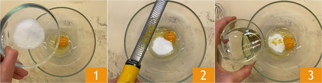 Um die Castagnole in der Heißluftfritteuse zuzubereiten, geben Sie in eine Schüssel das Ei, den Zucker 1, die Zitronenschale 2 und das Öl 3.