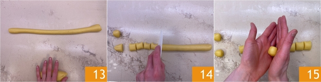 Formen Sie zwei lange Würstchen 13 und schneiden Sie sie in Stücke, um etwa 24 Teile 14 zu erhalten. Formen Sie Kugeln, indem Sie sie schnell zwischen den Händen rollen 15.