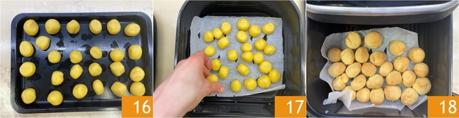 Sobald alle Castagnole fertig sind 16, gehen Sie zum Garen: Legen Sie ein perforiertes Backpapier in den Korb der Fritteuse, legen Sie die Kugeln hinein 17 und garen Sie sie bei 180°C für 8 Minuten in der Heißluftfritteuse, wobei Sie sie zur Hälfte der Garzeit wenden. Sie sollten leicht golden sein 18.