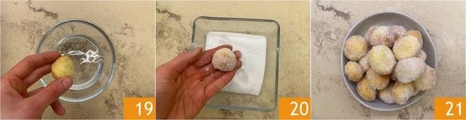 Sobald sie fertig sind, tauchen Sie sie schnell in Wasser 19 und dann in Kristallzucker 20: So, obwohl sie nicht in Öl frittiert wurden, wie beim klassischen Frittieren, haftet der Zucker leicht an. Ihre Castagnole in der Heißluftfritteuse sind bereit, genossen zu werden 21.