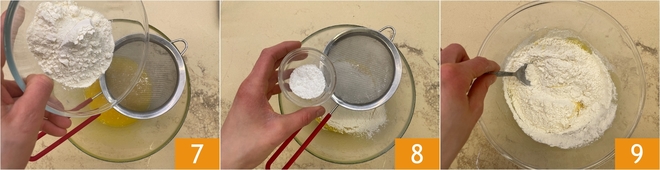 Integrieren Sie das Mehl 7 und das gesiebte Backpulver 8 und fügen Sie schließlich eine Prise Salz hinzu. Mischen Sie 9, bis Sie einen homogenen und kompakten Teig erhalten: Sie müssen nicht einmal von Hand kneten.