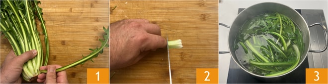 Um die Katalanischen in der Pfanne zuzubereiten, trennen Sie die Blätter vom zentralen Strunk 1 und entfernen Sie den härtesten Teil mit einem Messer 2. Tauchen Sie sie dann in reichlich kochendes Salzwasser 3 und blanchieren Sie sie für 3 Minuten.