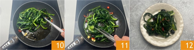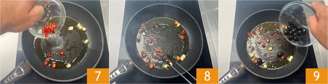 Geben Sie in eine Pfanne einen Schuss Öl, fügen Sie den Knoblauch und die Chilischote hinzu 7 und braten Sie sie 2 Minuten an. Fügen Sie dann die Anchovis hinzu und lassen Sie sie gut schmelzen 8. Fügen Sie die ganzen Oliven hinzu 9.