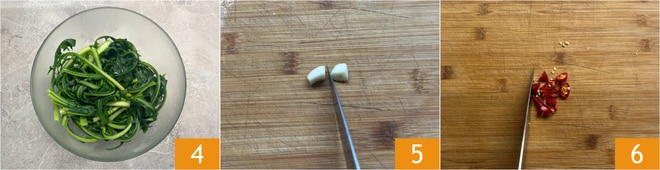 Abseihen und in eine Schüssel geben 4 und beiseite stellen. Schälen Sie den Knoblauch, halbieren Sie ihn 5 und schneiden Sie die Chilischote in Ringe 6.