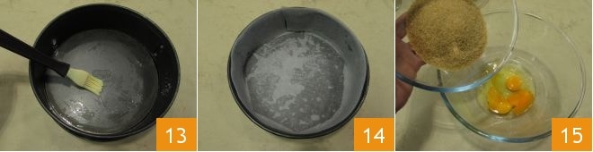 In der Zwischenzeit widmen Sie sich der Zubereitung des Kuchens. Fetten Sie die Form mit einem Hauch Öl ein 13 und legen Sie sie mit Backpapier aus 14. Geben Sie die Eier zusammen mit dem Zucker in eine große Schüssel 15.