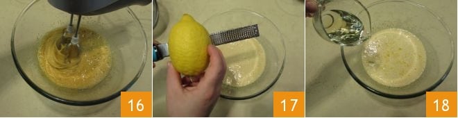 Bearbeiten Sie sie schnell mit einem Mixer 16, bis Sie eine schaumige Mischung erhalten. Fügen Sie die abgeriebene Zitronenschale 17 und das Pflanzenöl hinzu 18.