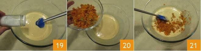 Rühren Sie mit einem Spatel und fügen Sie das Salz hinzu 19. Fügen Sie auch 100 g der Saftreste hinzu 20 und mischen Sie sie mit einem Spatel in die Mischung 21.