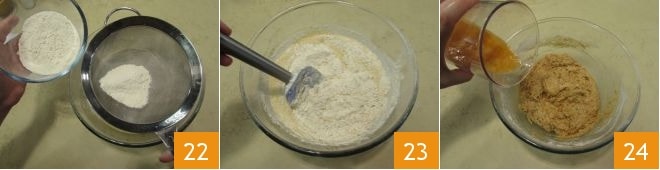 Sieben Sie das Mehl 22, geben Sie es in den Teig 23, und fügen Sie auch die 80 g Saft hinzu 24, während Sie weiter rühren.