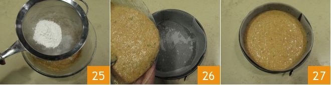 Integrieren Sie auch die gesiebte Stärke und das Backpulver in die Mischung 25. Mischen Sie alles gut, immer mit einem Spatel, und gießen Sie es in die Form (26-27).