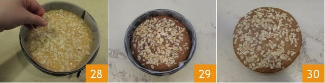 Vervollständigen Sie den Kuchen, indem Sie die Mandelblättchen auf der Oberfläche verteilen 28. Backen Sie ihn im vorgeheizten statischen Ofen bei 180°C für 35-40 Minuten 29 (wenn Sie einen Umluftofen verwenden, bei 160°C für etwa 30 Minuten). Um sicherzugehen, dass der Kuchen gar ist, machen Sie immer die Zahnstocherprobe. Lassen Sie ihn abkühlen 30, nehmen Sie dann den Kuchen aus der Form und servieren Sie Ihren Saft zusammen mit dem Kuchen mit Schalen!