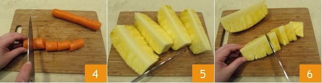 Schneiden Sie diese ebenfalls in Stücke von etwa ein paar cm 4 und beginnen Sie mit dem Wie man eine Ananas schält und schneidet. Entfernen Sie die äußere Schale und schneiden Sie sie zunächst in 4 Teile 5 und dann jede Portion in nicht zu kleine Stücke 6. Mit dem übrig gebliebenen Ananas können Sie entweder einen reinen Ananassaft oder ein Ananas-Minze-Sorbet herstellen.