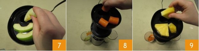 Zu diesem Zeitpunkt geben Sie das Obst in die Saftpresse: die Apfelstücke 7 und Karotten 8, beide mit der Schale, um sie nicht ihrer Nährstoffe zu berauben, und schließlich die Ananasstücke 9.