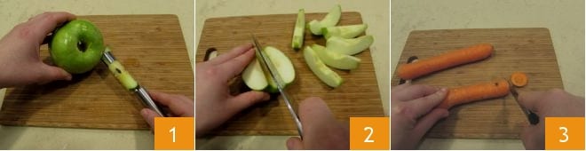 Um den Saft und den Kuchen mit Schalen zuzubereiten, beginnen Sie mit der Zubereitung des Saftes, beginnend mit dem Obst. Waschen Sie die Äpfel gründlich (Sie können sowohl Granny Smith als auch Golden verwenden) und entfernen Sie das Kerngehäuse mit einem speziellen Werkzeug 1, dann schneiden Sie sie in Spalten, ohne die Schale zu entfernen 2. Waschen Sie auch die Karotten gründlich und entfernen Sie die Enden 3.