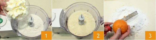 Um die Orangen- und Schokoladenkörbchen zuzubereiten, beginnen Sie mit dem Mürbeteig (für beste Ergebnisse konsultieren Sie das Rezept für Mürbeteig). In einem Mixer mit Klingen geben Sie das gesiebte Mehl und die Butter hinzu 1, lassen Sie die Maschine ein paar Augenblicke laufen, bis die Mischung sandig wird 2. Übertragen Sie sie auf ein Nudelbrett, formen Sie einen klassischen Brunnen, in dessen Mitte Sie die Samen der Vanilleschote, den Puderzucker und die abgeriebene Orangenschale geben 3,
