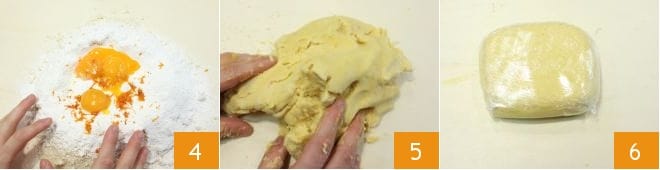 die Eigelbe 4; kneten Sie schnell von Hand 5, bis ein kompakter und elastischer Teig entsteht. Flachdrücken und mit Frischhaltefolie abdecken 6 und für eine halbe Stunde im Kühlschrank fest werden lassen.