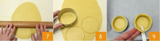 Nach der Ruhezeit nehmen Sie den Mürbeteig zurück, rollen ihn auf einem bemehlten Nudelbrett mit einem Nudelholz aus, bis ein 3-4 mm dicker Teig entsteht 7. Schneiden Sie mit einem Ausstecher von etwa 10 cm Durchmesser Kreise aus dem Teig 8, legen Sie den Teig in 6 eingefettete und bemehlte Tarteförmchen mit einem Durchmesser von 7 cm, drücken Sie den Teig an die Form und entfernen Sie den Überschuss mit einem kleinen Messer 9. Aus den Teigresten können Sie köstliche Kekse machen!