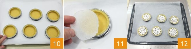 Sobald Sie alle Formen bedeckt haben 10, schneiden Sie 6 Kreise Backpapier von 10 cm Durchmesser aus, bedecken Sie den Boden der Förmchen mit den Papierkreisen 11 und legen Sie Backgewichte für das Blindbacken hinein 12 (oder Sie können auch getrocknete Hülsenfrüchte verwenden). Backen Sie die Tartelettes für 10 Minuten im vorgeheizten statischen Ofen bei 170° (oder im Umluftofen bei 150° für etwa 8 Minuten).