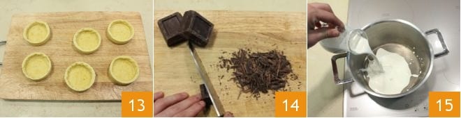 Nach dem Backen nehmen Sie sie aus dem Ofen und lassen Sie sie abkühlen, bevor Sie sie aus der Form nehmen 13. Nun machen Sie sich an die Ganache-Creme-Cremefüllung: Hacken Sie die Zartbitterschokolade mit einem Messer 14, erhitzen Sie die Sahne in einem Topf bei niedriger Hitze 15,