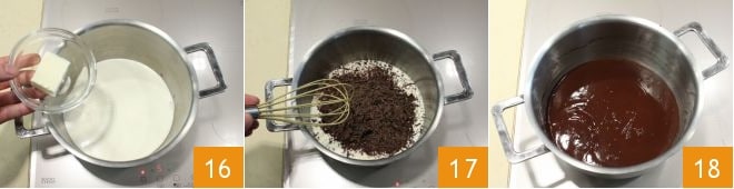 geben Sie die Butter hinzu 16 und lassen Sie sie köcheln, dann schalten Sie die Hitze aus und fügen die gehackte Schokolade hinzu 17 und rühren mit einem Schneebesen, bis sie vollständig geschmolzen ist 18. Lassen Sie die Ganache abkühlen.