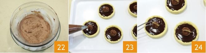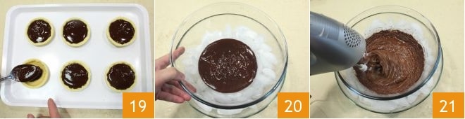 Füllen Sie die Tartelettes mit der Zartbitter-Schokoladencreme 19, dann geben Sie die restliche Creme in eine Schüssel, unter die Sie eine weitere Schüssel voller Eis stellen 20. Schlagen Sie die Creme mit einem elektrischen Handrührgerät 21