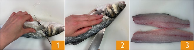 Um das Wolfsbarsch-Ceviche zuzubereiten, beginnen Sie als erstes mit der Reinigung des Fisches. Schuppen Sie ihn unter fließendem Wasser, dann machen Sie einen Schnitt am Bauch, entnehmen Sie die Eingeweide und spülen ihn erneut unter fließendem Wasser ab, um eventuelle Verunreinigungen zu entfernen. Machen Sie einen schrägen Schnitt, knapp hinter den Kiemen 1, der vom Rücken beginnt und sich mit dem vorher am Bauch gemachten Schnitt verbindet. Schneiden Sie die Schwanz- und die Rückenseite entlang der Wirbelsäule ein 2, so erhalten Sie das erste Filet; wiederholen Sie das gleiche Verfahren für das zweite 3.