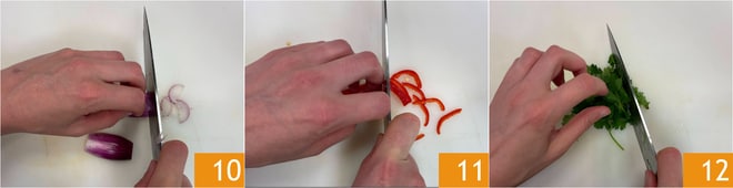 Schneiden Sie fein mit dem Messer: die Zwiebel 10, die Chilischote 11, nachdem Sie die Samen entfernt haben, und den Koriander 12.