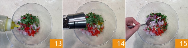 Fügen Sie alles zum Wolfsbarsch hinzu, würzen Sie mit Öl 13, Salz und Pfeffer 14 und mischen Sie vorsichtig 15. Decken Sie es mit Frischhaltefolie ab und lassen Sie es 15-20 Minuten im Kühlschrank marinieren, damit sich die Aromen verbinden.