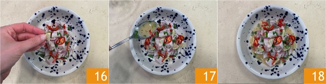 Richten Sie an, indem Sie mit frischen Korianderblättern und Limettenscheiben garnieren 16, und vollenden Sie mit einem Löffel Marinade 17. Das Wolfsbarsch-Ceviche ist bereit zum Servieren 18.