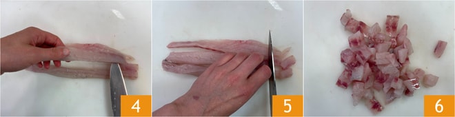 Schneiden Sie die Wolfsbarschfilets zuerst in Streifen 4 und dann in Würfel von gleichmäßiger Größe 5 6.