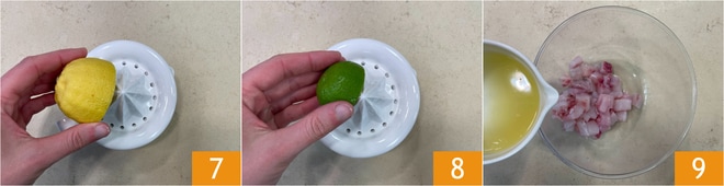 Pressen Sie die Zitrone 7 und die Limette 8 aus und gießen Sie den Saft über die Wolfsbarschwürfel 9.