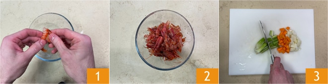 Um das Risotto mit Champagner, Rote Bete und Garnelen zuzubereiten, reinigen Sie die Garnelen 1 und bewahren Sie die Reste auf 2. Schneiden Sie die Karotte, den Sellerie und die Zwiebel in kleine Stücke 3.