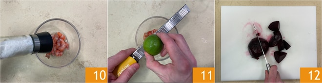 Würzen Sie die Garnelen mit Öl, Salz 10, Pfeffer und der Schale einer Limette 11. Schneiden Sie nun die vorgekochte Rote Bete 12.