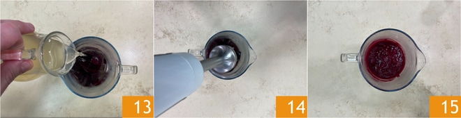 Geben Sie sie in das Mixerglas zusammen mit einer Kelle Sud 13 und dem Saft einer halben Limette. Mixen Sie mit dem Stabmixer 14, um eine Creme zu erhalten 15.