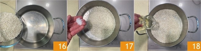 Bereiten Sie das Risotto vor: Rösten Sie die Reiskörner in einem Topf 16 und fügen Sie bereits eine Prise Salz hinzu 17. Löschen Sie mit einem Glas Champagner ab 18.