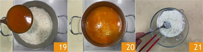Fügen Sie den Sud Kelle für Kelle hinzu 19, während die Flüssigkeit aufgenommen wird 20. In der Zwischenzeit lassen Sie die Stracciatella abtropfen, um sie mit einem feinen Sieb zu trocknen 21.