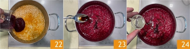 Sobald das Risotto fast fertig ist, binden Sie es mit der Rote-Bete-Creme 22, einem Schuss Öl und Sojasauce 23. Fügen Sie dann den Saft einer halben Limette hinzu 24 und vollenden Sie das Kochen.