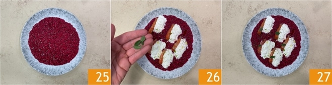 Richten Sie das Risotto an 25, garnieren Sie es mit Stracciatella-Quenelles, den rohen Garnelen 26, einem Schuss Öl, Limettenschale und Majoranblättchen. Servieren Sie sofort Ihr Risotto mit Champagner, Rote Bete und Garnelen 27!