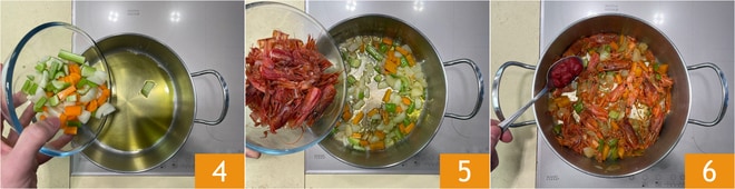 Braten Sie das Gemüse mit einem Schuss Öl 4 an, zusammen mit den Garnelenschalen 5 und einem Esslöffel Tomatenmark 6.