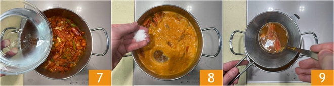 Sobald sie geröstet sind, fügen Sie Wasser bis zum Rand hinzu 7 und decken Sie es mit einem Deckel ab. Lassen Sie es 30 Minuten kochen und salzen Sie es 8. Filtern Sie den Sud 9 und halten Sie ihn warm.