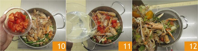 die geschnittenen Tomaten und bedecken Sie mit kaltem Wasser 11. Die Brühe muss mindestens 30 Minuten bei mittlerer bis niedriger Hitze kochen, danach können Sie sie filtern 12 und warm halten, um den Reis zu kochen.