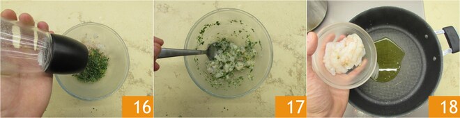Salz und Pfeffer 16, mischen Sie und stellen Sie es beiseite, um den Reis zu verarbeiten 17. Erhitzen Sie in einem Topf, in dem Sie auch den Reis kochen werden, einen Schuss Öl sehr gut und braten Sie die ganzen Scampi an 18.