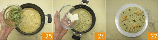 Nehmen Sie den Topf vom Herd und fügen Sie das Scampi-Tartar 25, die Butter 26 und den Pfeffer hinzu, verrühren Sie alles gut. Servieren Sie das Risotto, indem Sie den Teller mit den restlichen angebratenen Scampi und den Oreganozweigen 27 garnieren.