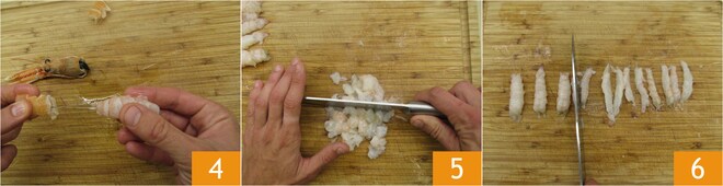 Bereiten Sie die Petersilienmischung vor, die Sie zum Würzen des Scampi-Tartars verwenden werden. Reinigen Sie nun die Scampi, entfernen Sie den Panzer 4, entfernen Sie den Darm und schneiden Sie die Hälfte der Scampi in Tartar 5 und den Rest der Länge nach in zwei Hälften 6.